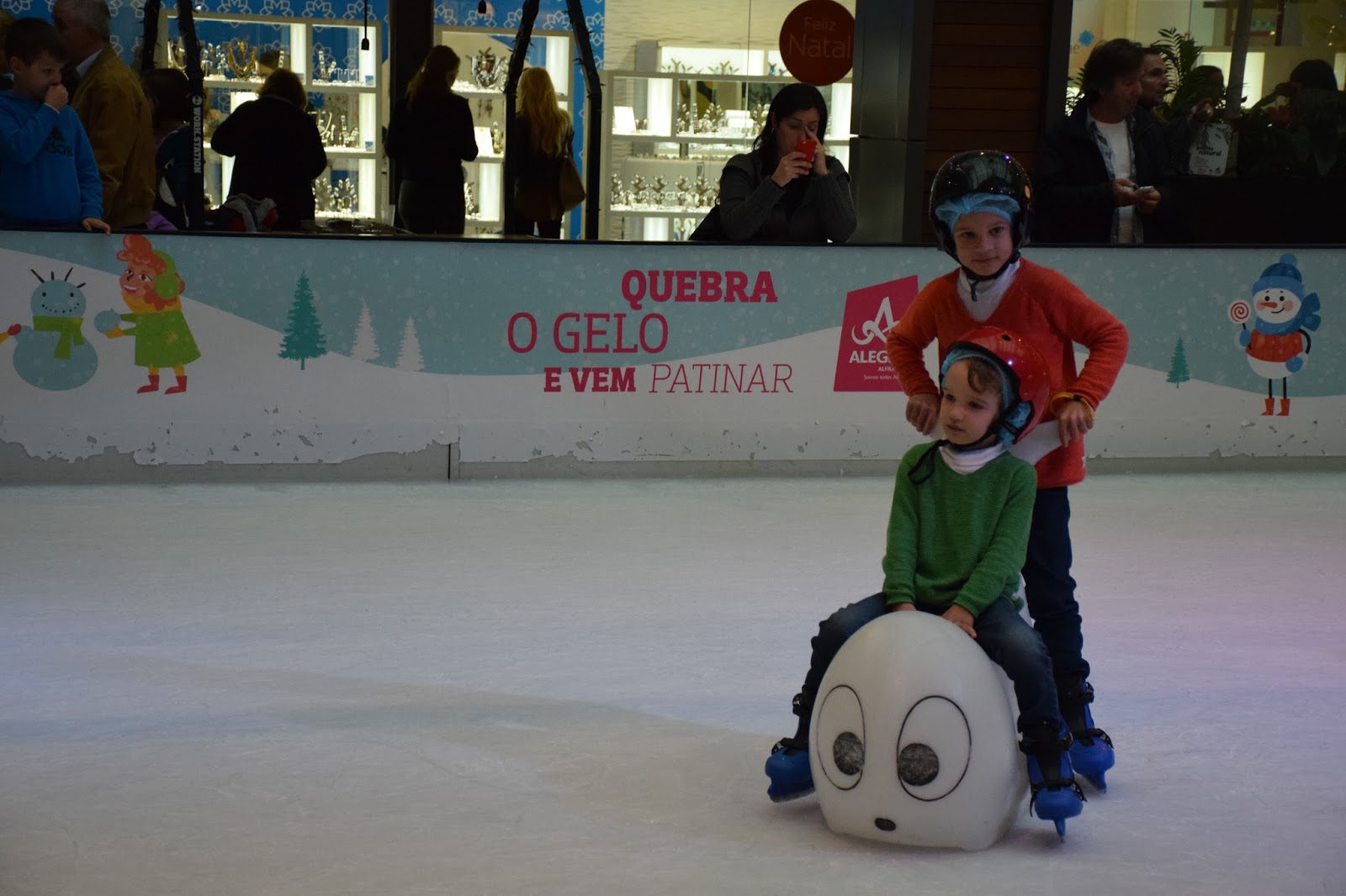 Só então vimos a pista de gelo, que por incrível que pareça não estava cheia. Eles pediram para andar e lá foram. Desta vez só os dois,