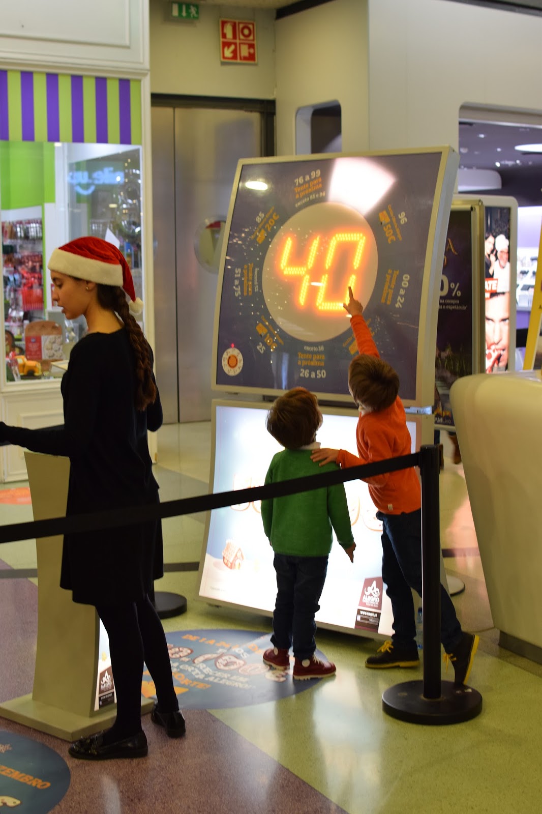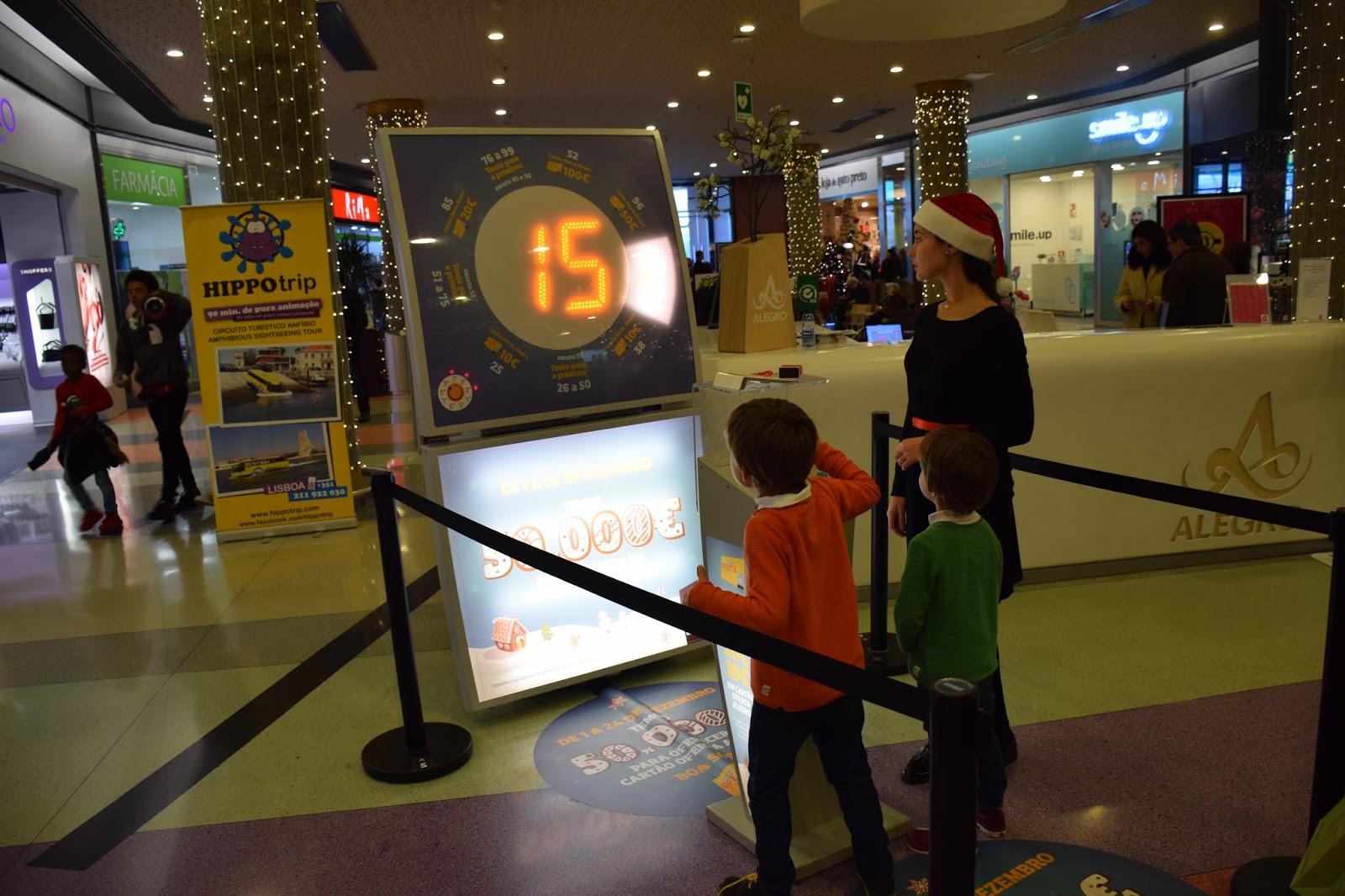 O Alegro Alfragide tem uma promoção em que está a oferecer 50.000€ em cartão. Por cada 20€ em compras podemos acionar um tômbola que pode dar-nos cartões presente no valor de 10€, 20€, 50€ ou 100€. Eles já não queriam sair dali. Queriam ver a tômbola rodar e faziam grande festa com os prémios. Pediram muitas vezes para jogar também, e só quando a senhora lhe explicou que era preciso fazer compras e trazer o talão das compras para poderem jogar, se resignaram a ter que sair dali, mas logo para outra atração.